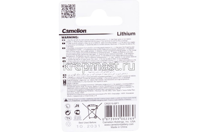 Батарейка Camelion CR2016 в интернет-магазине «Мастер Крепежа» по цене 66 руб. Более 12 наименований товаров в наличии в категории Батарейка ТАБЛЕТКА. Купить батарейка camelion cr2016 в Лениногороск выгодно Вы можете on-line на нашем сайте, или отправив заявку по почте, а также по телефону или в пункте выдачи компании г. Казань, ул. Татарстан, 9, магазин "Мастер Крепежа". Доставка по Республике Татарстан и другие регионы РФ.