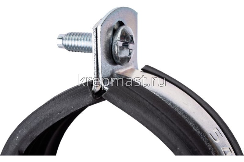 Хомут сантехнический с гайкой 54-58 мм представляет собой две металлические пластины, соединенные по краям регулировочными винтами м6 и резиновым уплотнителем. К хомуту приварена гайка м8 с метрической резьбой. Диаметр обжима трубы составляет от 54 до 58 мм. Изготавливается из оцинкованной стали толщиной 1.2 мм.