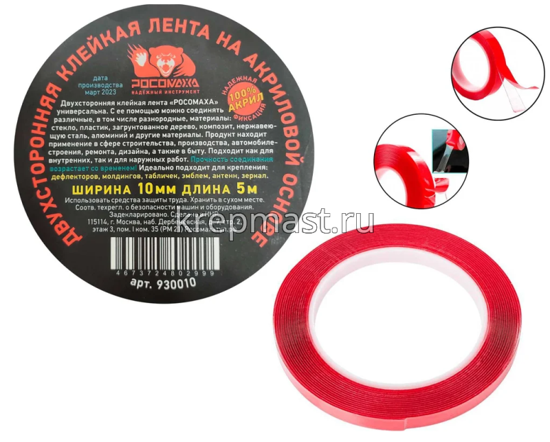 Скотч двухсторонний 3М Росомаха 10мм х 5м - используется для крепления к кузову автомобиля пластиковых деталей. Изделие отличается высокой адгезией, прочностью, долговечностью. Благодаря уникальным вязко-эластичным свойствам создается надежное соединение.