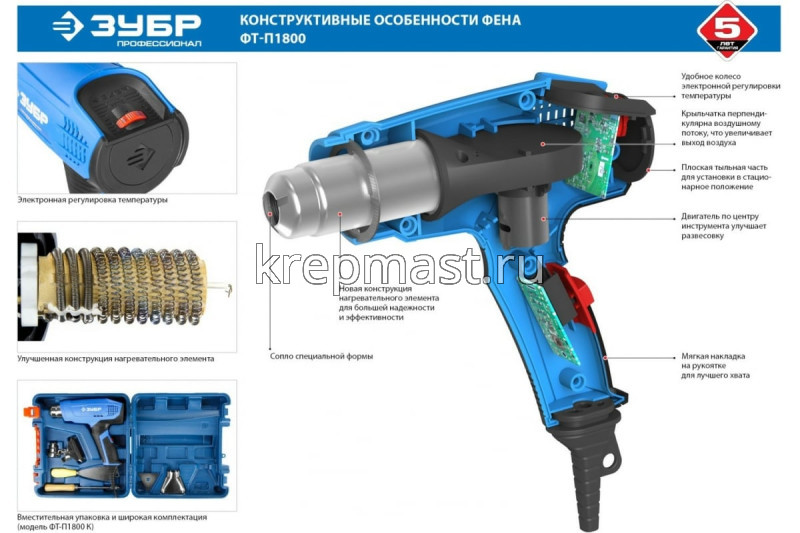 Фен ЗУБР (1800Вт, 80-550С ) предназначен для бытового использования. Имеет настройку температуры воздуха. Подходит для типовых задач: разморозить, просушить, нагреть. Рукоятка закрытого типа обеспечивает удобство в использовании. Кейс решает вопрос хранения и транспортировки.