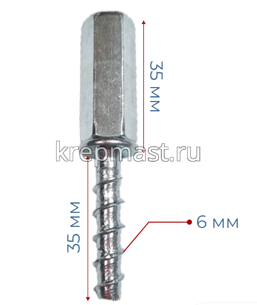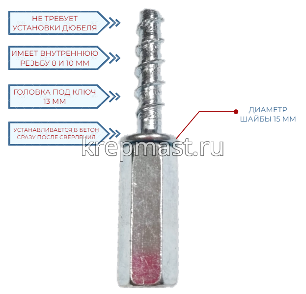 Анкер - шуруп PNB по бетону 6 х 35 с удлиненной гайкой(вн.диам.м8/10мм) - готов к закручиванию в основаиие сразу после засверливания и не требует установки дюбеля. Шестигранная головка имеет внутреннюю соосную резыбу двух диаметров М8 и М10 для креплления метрческой шпильки.