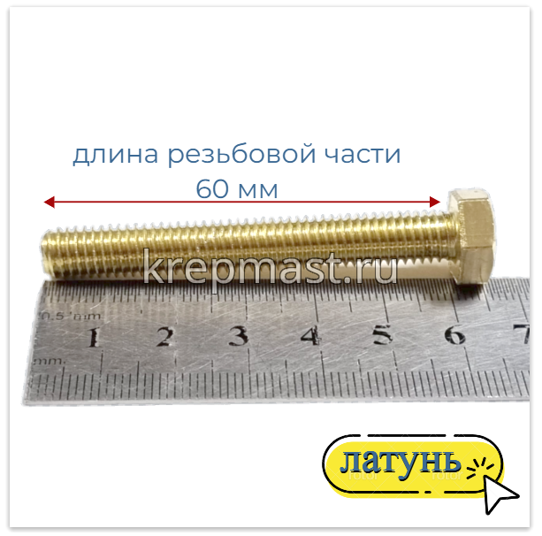 Латунный болт DIN 933 М8 х 60используется в случае, когда необходимо создать немагнитный узел. Латунный болт М8 применяется в приборостроении, авиации, атомной промышленности. Латунный крепеж стоек к органическим кислотам и углекислым растворам.