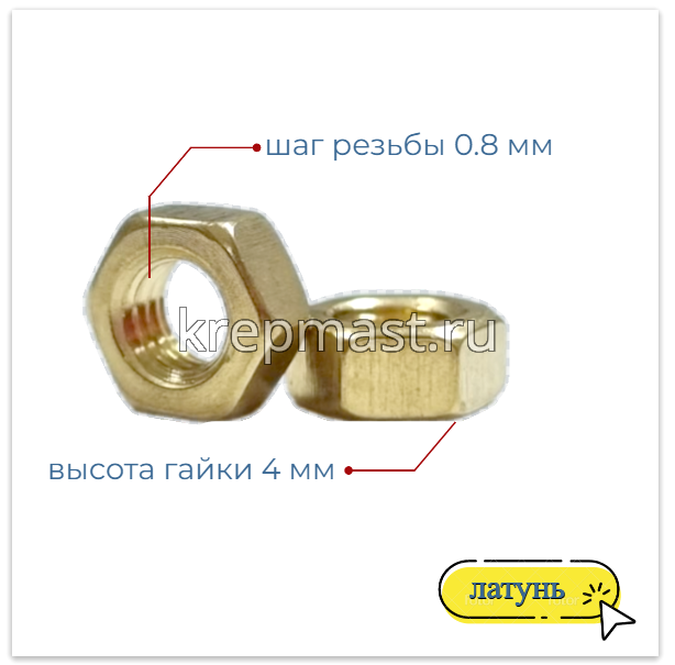 Гайка 6-гр. М 5 (0,8) латунь DIN 934 в интернет-магазине «Мастер Крепежа» по цене 18 руб. Более 7 наименований товаров в наличии в категории Гайки латунные DIN 934 (ГОСТ 5927) . Купить гайка 6-гр. м 5 (0,8) латунь din 934 в Лениногороск выгодно Вы можете on-line на нашем сайте, или отправив заявку по почте, а также по телефону или в пункте выдачи компании г. Казань, ул. Татарстан, 9, магазин "Мастер Крепежа". Доставка по Республике Татарстан и другие регионы РФ.