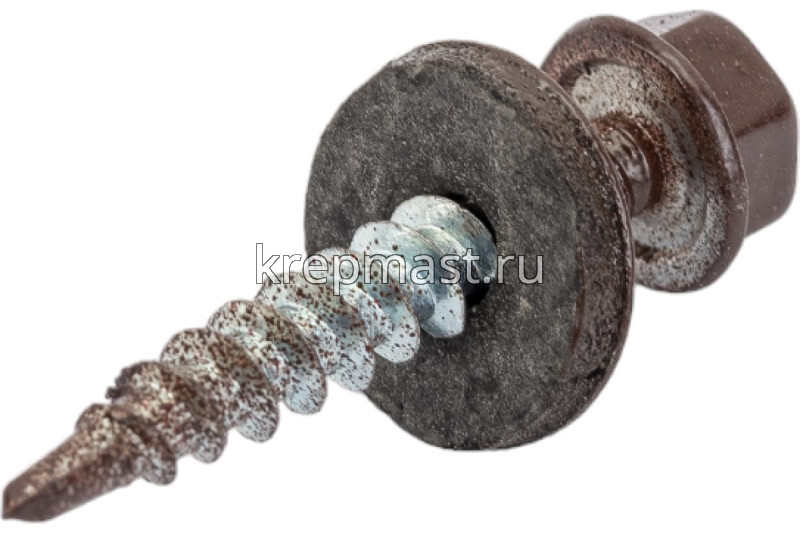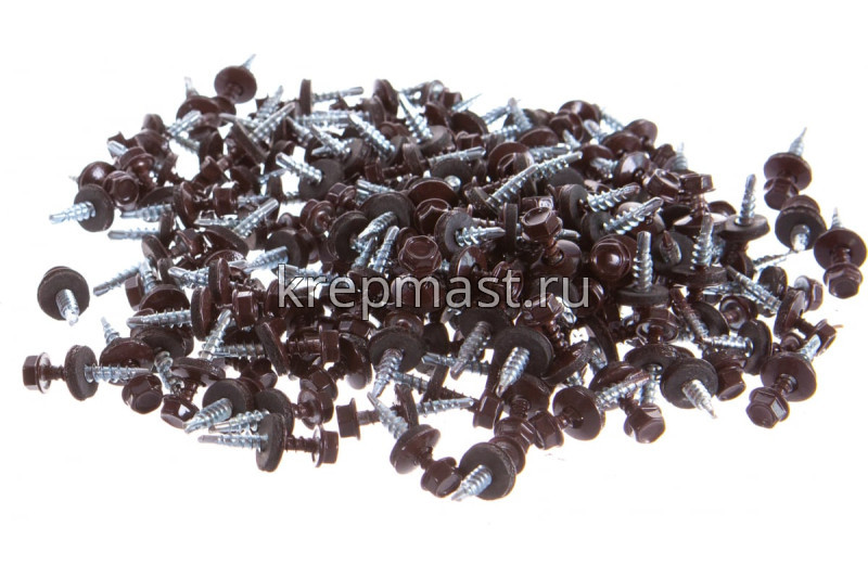 Кровельный саморез окрашенный с шайбой и резиновой прокладкой EPDM DIN 7504 4,8 х 29 по дереву RAL 8017 (цвет шоколадно-коричневый) - представляет из себя саморез с шестигранной головкой, фланцем и резиновой прокладкой для эффективного прижатия листового металла к основанию.
