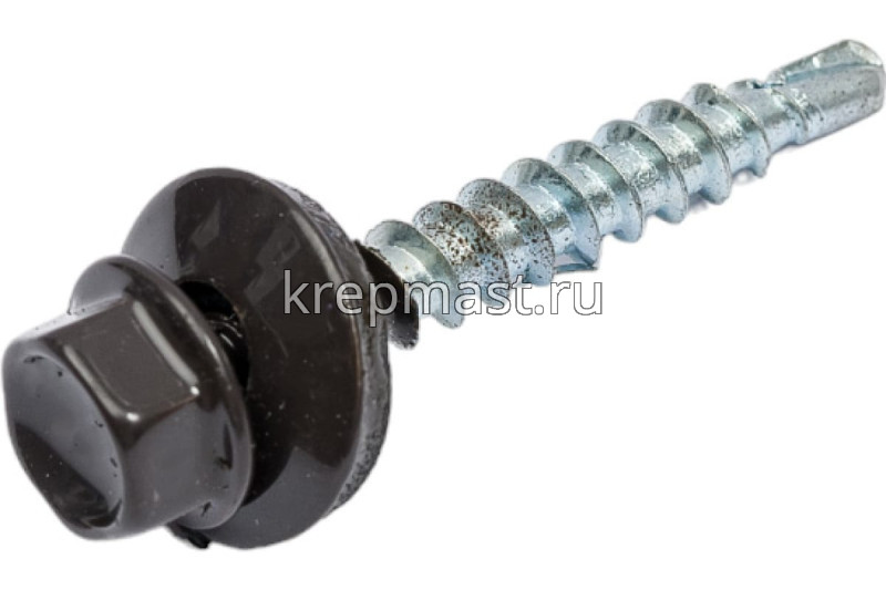 Кровельный саморез окрашенный с шайбой и резиновой прокладкой EPDM DIN 7504 4,8 х 38 по дереву RAL 8019 (цвет темно-коричневый) - представляет из себя саморез с шестигранной головкой, фланцем и резиновой прокладкой для эффективного прижатия листового металла к основанию.
