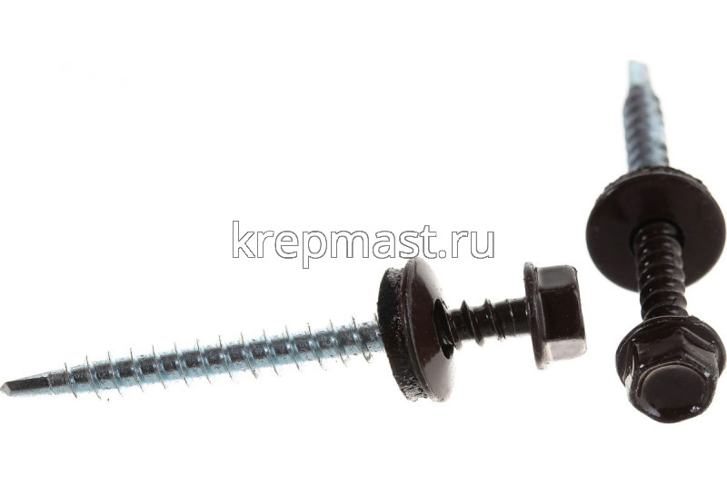 Кровельный саморез окрашенный с шайбой и резиновой прокладкой EPDM DIN 7504 4,8 х 51 по дереву RAL 8017 (цвет шоколадно-коричневый) - представляет из себя саморез с шестигранной головкой, фланцем и резиновой прокладкой для эффективного прижатия листового металла к основанию.