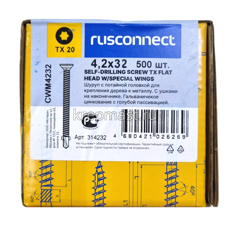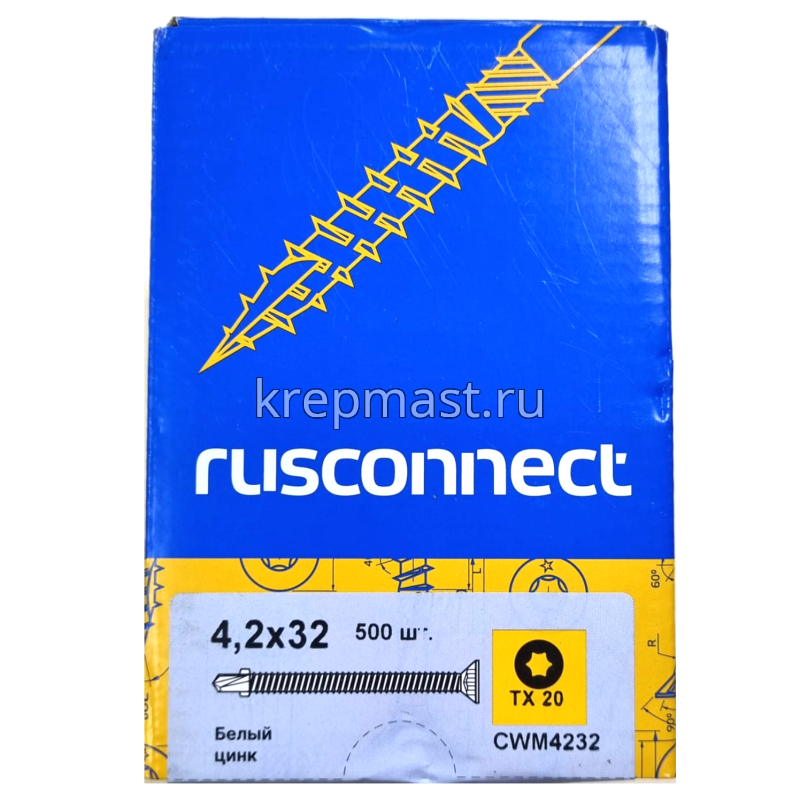 Саморез кровельный ТХ20 с ушками без шайбы DIN 7504 P 4,2х32 потай. - сверло оцинк. Rusconnect применяется для крепления деревянной доски к металлической обрешетке. На острие самореза находится бур с двумя выступающими "ушками", которые свободно проходят через древесину и обламываются, когда саморез достигает металла. На нижней стороне потайной головки есть несколько выступов предназначенных для самозенковки и аккуратного утапливания заподлицо с поверхностью. Помимо досок данными саморезами можно крепить фанеру, ДСП и плиты МДФ.
