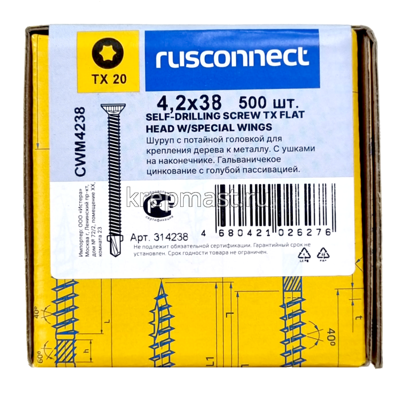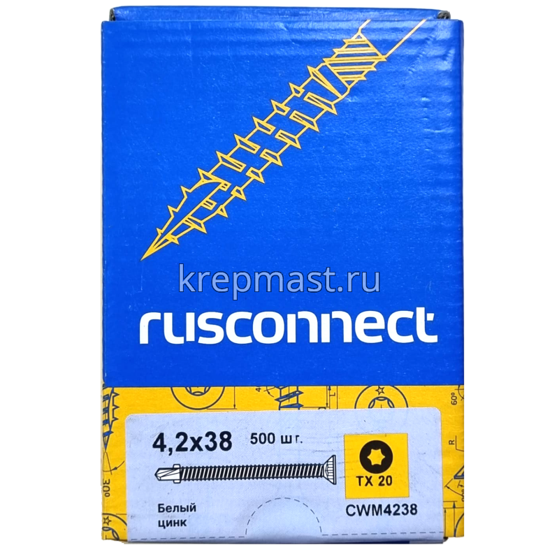 Саморез кровельный ТХ20 с ушками без шайбы DIN 7504 P 4,2х38 потай. - сверло оцинк. Rusconnect применяется для крепления деревянной доски к металлической обрешетке. На острие самореза находится бур с двумя выступающими "ушками", которые свободно проходят через древесину и обламываются, когда саморез достигает металла. На нижней стороне потайной головки есть несколько выступов предназначенных для самозенковки и аккуратного утапливания заподлицо с поверхностью. Помимо досок данными саморезами можно крепить фанеру, ДСП и плиты МДФ.
