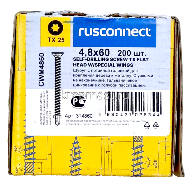 Саморез кровельный ТХ20 с ушками без шайбы DIN 7504 P 4,8х60 потай. - сверло оцинк. Rusconnect применяется для крепления деревянной доски к металлической обрешетке. На острие самореза находится бур с двумя выступающими "ушками", которые свободно проходят через древесину и обламываются, когда саморез достигает металла. На нижней стороне потайной головки есть несколько выступов предназначенных для самозенковки и аккуратного утапливания заподлицо с поверхностью. Помимо досок данными саморезами можно крепить фанеру, ДСП и плиты МДФ.