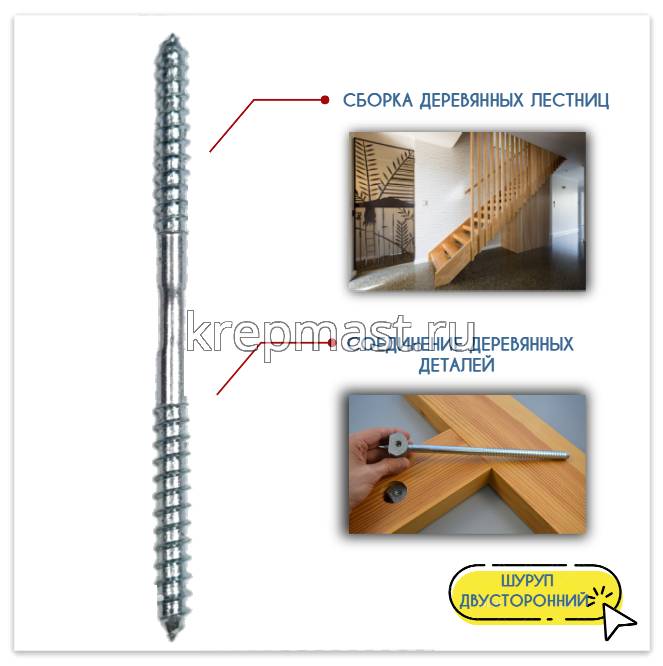 Сантехническая шпилька (двусторонний саморез) М6 х 100 используетя при сборке деревянных лестниц в многоярусных квартирах или загородных домах. С помощью крепежа можно обеспечить прочное, надежное и практически незаметное соединение опорных элементов массивного сооружения. Двусторонний саморез для балясин важно правильно подобрать по длине и диаметру изделия.