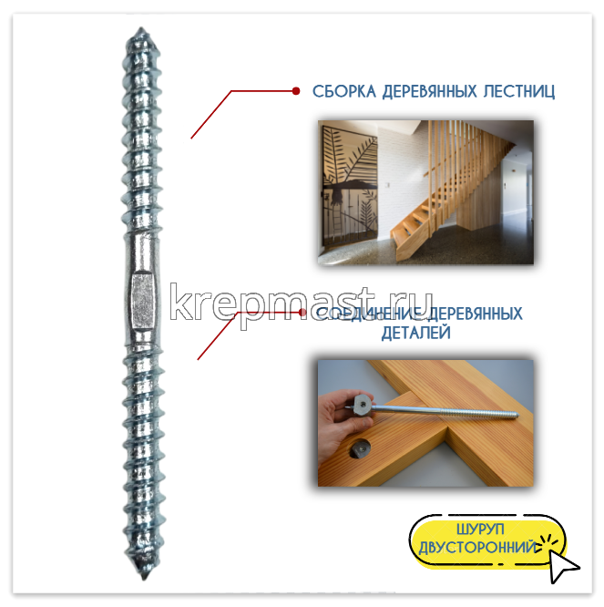 Сантехническая шпилька (двусторонний саморез) М8 х 100 используетя при сборке деревянных лестниц в многоярусных квартирах или загородных домах. С помощью крепежа можно обеспечить прочное, надежное и практически незаметное соединение опорных элементов массивного сооружения. Двусторонний саморез для балясин важно правильно подобрать по длине и диаметру изделия.