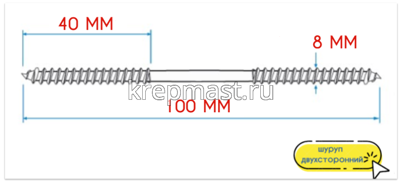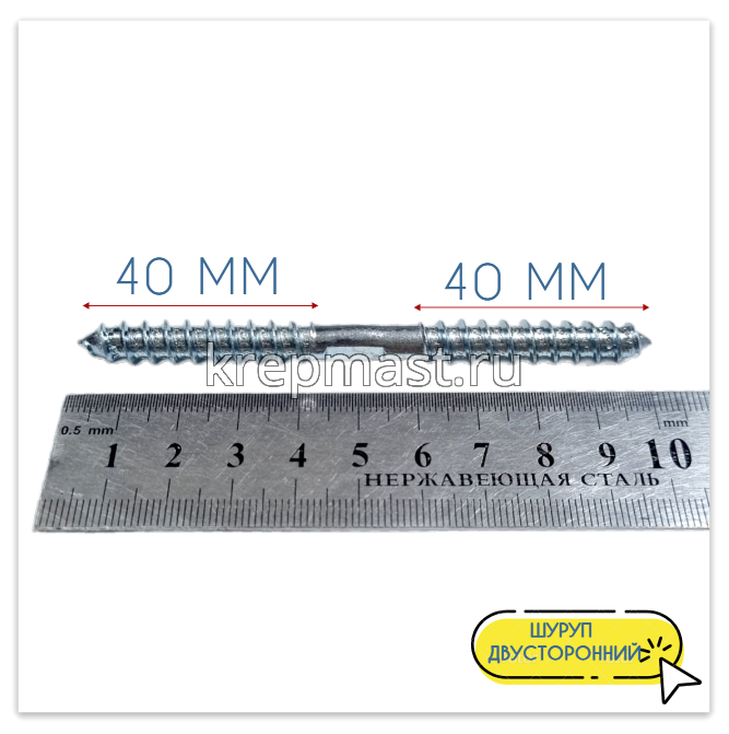 Двусторонний шуруп изготавливается из высококачественной инструментальной стали марки С10008. Для защиты от негативного воздействия влаги и появления коррозии, саморез с двухсторонней резьбой покрывается тонким слоем белого цинка (горячее цинкование).