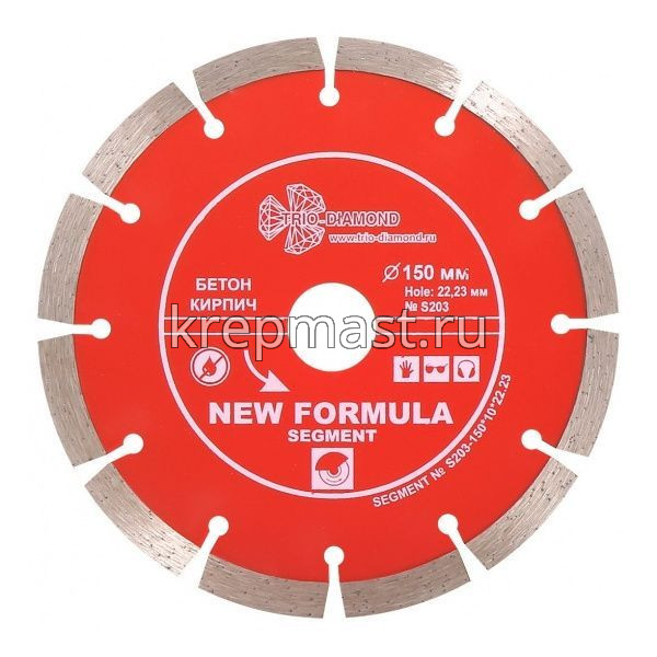 Алмазный диск Trio Diamond New Formula Segment 150 мм -изготовлен методом холодного прессования. Диск является универсальным и подходит для разного спектра работ. Используется для резки бетона, бордюрного камня, шамотного кирпича, твердого песчаника и тротуарной плитки. Высота алмазного слоя 10 мм. Посадочное отверстие - 22,23 мм. Толщина алмазного слоя 2,2 мм. Глубина реза составляет 30 мм. Сегментная кромка способствует выводу пыли и мелких частиц из области реза. Диск с повышенной производительностью используется для работы на УШМ.
