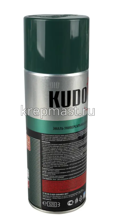 Универсальная алкидная краска эмаль-аэрозоль KUDO RAL 1007 темно-зеленая 520 мл удобна в нанесении за счет спрей-системы, используется для покраски стекла, пластика, бумаги, дерева, металла и др. Краска быстро высыхает и обладает высокой адгезией. Применяется для наружных и внутренних работ. Краска устойчива к ультрафиолету.