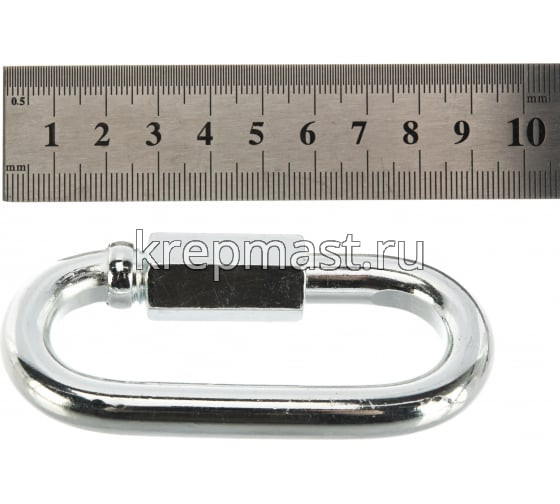 Соединитель цепей с гайкой 10 х 69,0 (карабин винтовой) - cтальной карабин "звено цепи" с винтовой муфтой (фиксатором) применяется для быстрого и надежного крепления тросов и цепей между собой или к чему-либо. Размер карабина определяется по диаметру поперечного сечения проволоки (прутка) и составляет 10 мм.